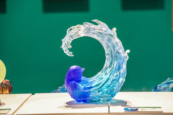 展览现场,一件件融合东方美学与当代语境的工艺作品,吸引众多观众细细欣赏、拍照留念。福州大学厦门工艺美术学院的玻璃作品《精卫》,以深蓝色磨砂质感再现神话意象,传递坚韧不息的精神力量。