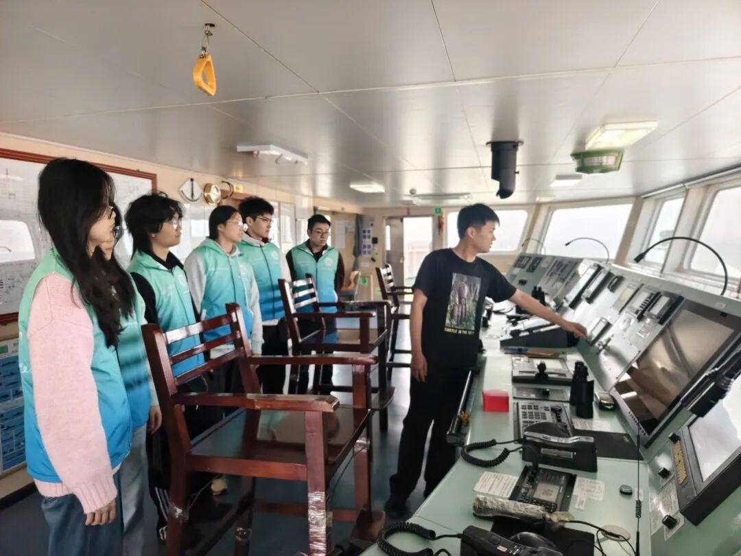 实践队一行来到晋江太平洋集装箱码头,登上正在装卸作业的集装箱船舶,开启一场沉浸式的“海上课堂”。在海事人员和船员的共同讲解下,学子们近距离接触船舶导助航设备、通讯系统、救生设备等核心设施,详细了解各类设备的功能、操作规范及日常维护要点。