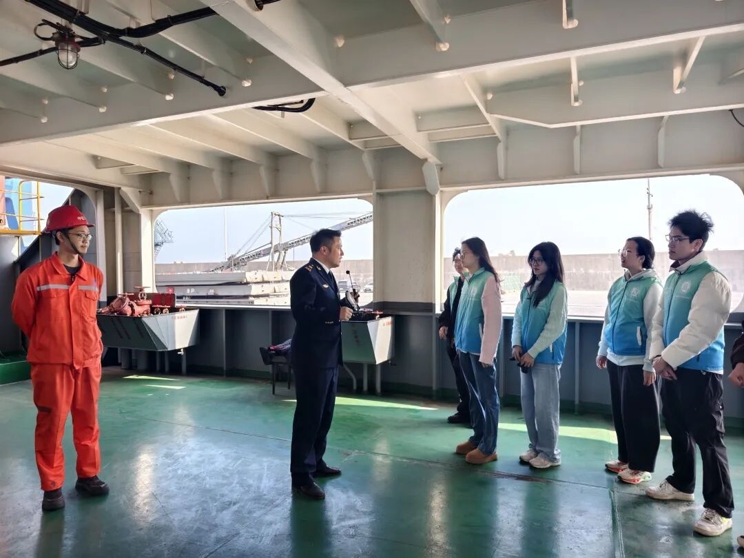 从船舶航行的安全注意事项,到货物装卸作业的安全管控要求,从海上应急处置的基本流程,到船员的日常工作内容,讲解人员娓娓道来,学子们边走、边看、边问,围绕船舶设备原理、海上安全防护、航运行业发展等内容与海事人员、船员深入交流。在轰鸣的作业声中,真切感受航运业的蓬勃发展态势,也对“向海图强”的内涵有了更真切的体会。
