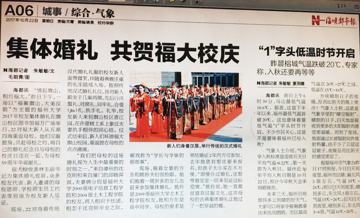 海峡都市报(2017-10-22):集体婚礼 共贺福大校庆