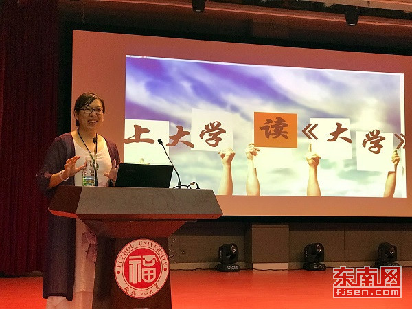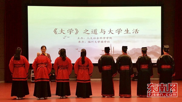 东南网10月9日讯(通讯员 孙思悦)“大学之道,在明明德,在亲民,在止于至善”,福大图书馆博学厅里传来朗朗书声,人文学院薛美秀老师正带领着17级新生诵读《大学》,举行成人礼。