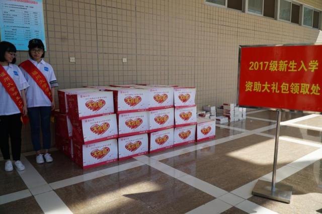 存放在“绿色通道”处的资助大礼包。(陈思涵 摄)