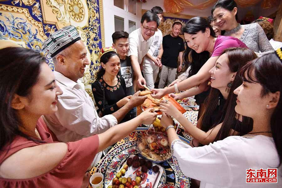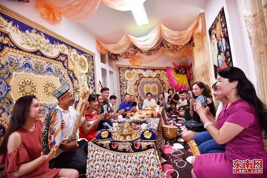 14日,福州大学少数民族学生之家——刘敏榕工作室投入使用。当日,在工作室内,来自新疆的少数民族新生和家长,与该校老师一起品尝着从家乡带来的馕饼和水果,一起唱着新疆民歌,其乐融融。