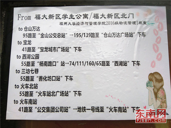 东南网3月27日讯“公交站牌上只有站点,没有景点目的地名称,路痴的我刚来福州的时候,完全不懂如何看公交站牌到达目的地。”活动后期采访的一位女同学说道:“有了这些可爱的路线图,以后不用下载软件,也不需要别人带路,我可以来场一个人的旅行了!”