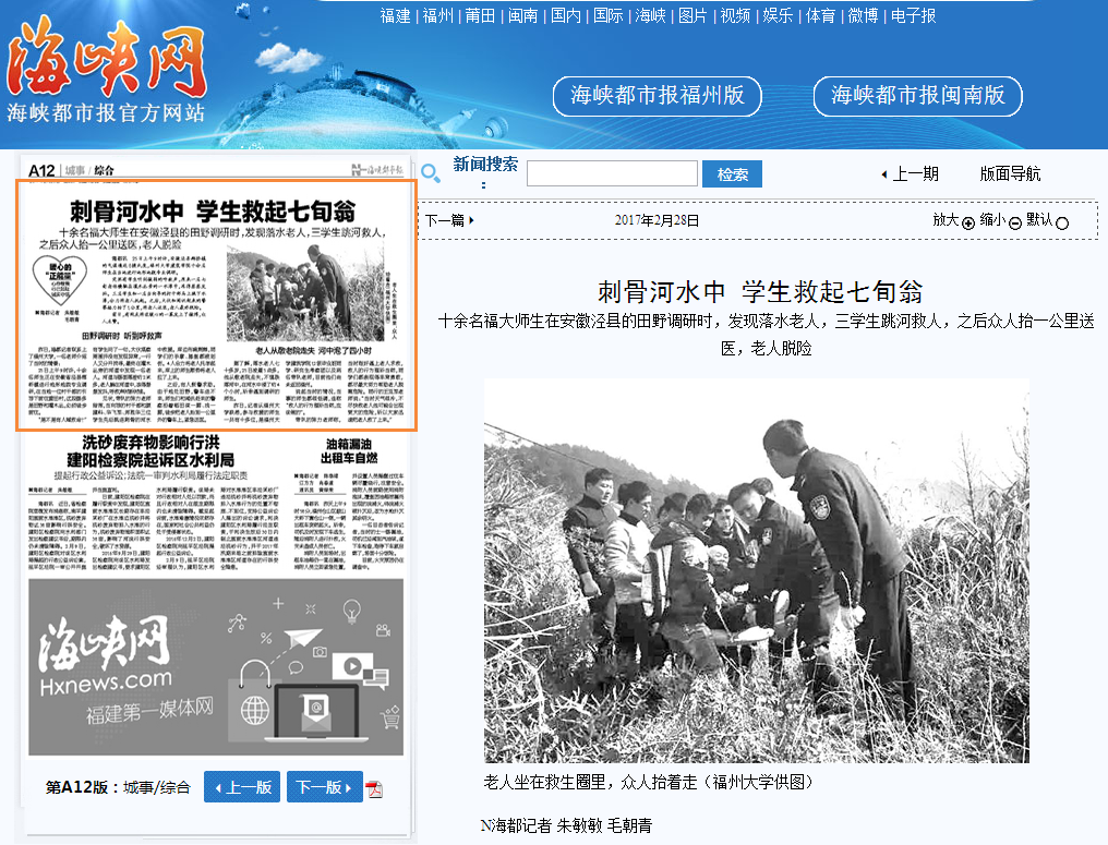十余名福大师生在安徽泾县的田野调研时,发现落水老人,三学生跳河救人,之后众人抬一公里送医,老人脱险。