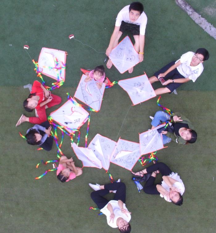 中外学子一起用黑色的马克笔,在80只空白风筝分别写下了各自彩色的梦想,并一起将风筝放飞。活动也吸引了许多不同年龄段的孩子们前来共同参加,同学们手把手地教孩子们组装风筝、写下理想和放飞风筝,一起许下未来的共同心愿。