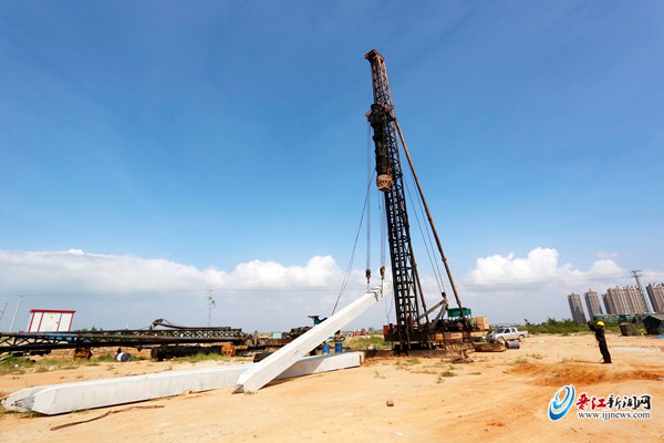 5日9时许,在福州大学晋江科教园区项目工地,10多台土方车和数台挖掘机来回穿梭忙碌。几名工人正在一台大型的打桩机上,为该项目的第一根桩基试桩做准备工作。不一会,打桩机探出缆绳,拖起一根粗长的水泥桩,吊至上方,垂直而放,稳落地面,工人对准位置后,按钮启动,水泥桩被缓缓打入地面。