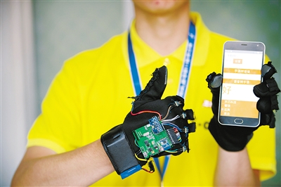 图为福州大学《E—chat聋哑人社交手套》项目组的成员在演示将手势转换为语音信息。