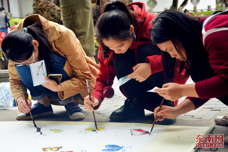 东南网4月15日讯(通讯员 范玉萍 安小飞)一杆毛笔,一纸画卷,短短几笔,一幅栩栩如生的蝶恋图便跃然纸上......4月14日,福州大学2015级物流工程班的学子走进西湖公园与左海公园,邀游客共同现场绘画,助攻传统国画艺术传承。