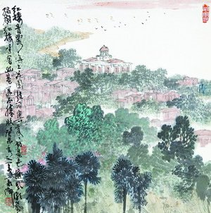 他的山水画里,满眼郁郁葱葱,处处南国风韵——八闽大地盘根错节、叶茂枝繁的苍天古榕,浪珠飞溅的鹭江潮涌,云瀑叠嶂,流水有声,山势起伏,峰回路转,树木葳蕤,婀娜多姿。他深受老师影响,师法自然,画笔远离庸俗与琐碎,恣意挥洒,泰然从容,作品如雨后空山,隽秀清新之风扑面而来。