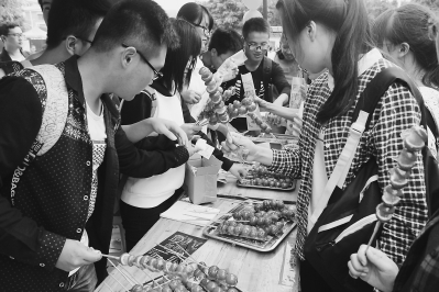 近日,福州大学学子发起冰糖葫芦再设计活动,共设计出蜂蜜冰霜衣、果酱糖衣、百样水果糖衣等多种创新型口味的冰糖葫芦。肖华振摄