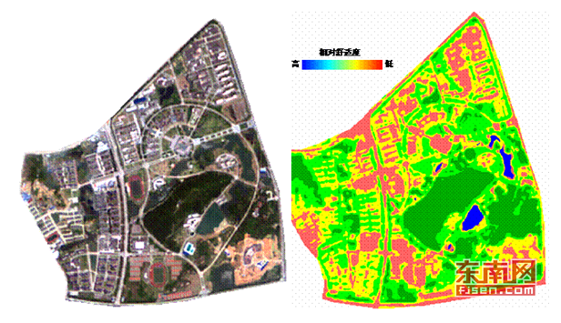 福州大学环境与资源学院徐涵秋教授进一步将这些气象数据与中高分辨率遥感影像数据集成建模,研制出旗山校区的第一张夏季舒适度图。图中显示,福大旗山校区经过近年的景观和生态改造,人居舒适度有了明显的提高。师生们可以通过该图进一步了解校园的人居环境,在绿色区域进行室外锻炼,在红色区域合理使用空调,节约用电,共同建设生态宜居的绿色低碳校园。