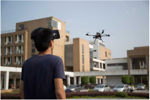 在刚刚落幕的福建省首届“互联网+”大学生创新创业大赛中,一款名为“极目虚拟四轴飞行器”的作品脱颖而出,夺得创意组金奖。这是由福州大学经济与管理学院、物理与信息工程学院学生合作设计并策划的创业项目。这款飞行器结合了“无人机”和“虚拟现实技术”两个当下热门技术,不少人直呼它为“千里眼”。图为发明者之一正在测试并展示使用飞行器。 福州大学 刘天宇/摄