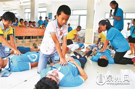 近日,福州大学和福建医科大学暑期社会实践队志愿者,来到泉港区益海小学,开展“生命体验式自护教育”活动,为留守儿童们表演了生动的安全情景剧,手把手教学海氏急救法、心肺复苏、伤口包扎、烫伤处理等急救知识,帮助孩子们过一个安全快乐的暑假。 (林银秀 摄)