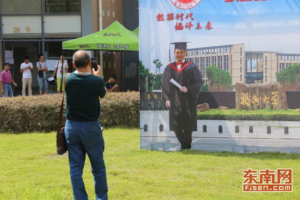 在福大生活三区的草坪上,竖立着一块大展板,展板上是一个身着学士服的福大学子站在福大东门的毕业留影。展板上学子的脸部镂空,新生可站在学士服后现场变身“毕业生”,进行拍照。