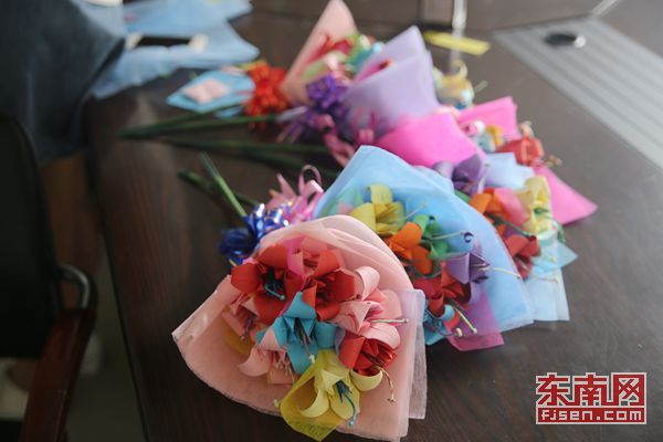 八朵一束,讲究颜色搭配,用五彩玻璃纸包装,最后系上一条丝带,一束纸花束就大功告成。据活动负责人、电气工程系学生会主席李雅捷介绍,他们花了两天时间,共折了11束百合花,在教师节当天送给系里的老师。