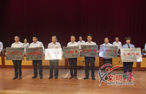 省领导为省级文明村镇、单位、学校、社区、景区、行业代表颁奖授牌,分别为泉州市洛江区马甲镇、漳州市住房和城乡建设局、福州大学、福州市鼓楼区华大街道屏山社区、厦门市园林植物园、莆田市工商系统、宁德市电力系统。(本网记者王帅 冯川叶 实习生 杨骆杰/摄)