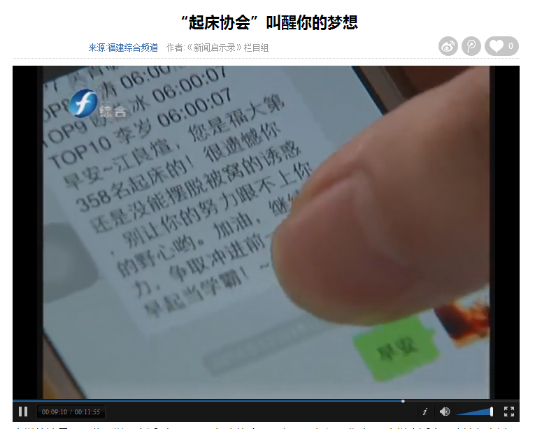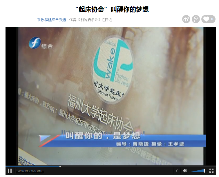 福建电视台综合频道2015年5月26日的《新闻启示录》栏目播出了《“起床协会”叫醒你的梦想》,对我校起床协会和早起微信签到活动进行了相关报道。视频截图及链接如下: