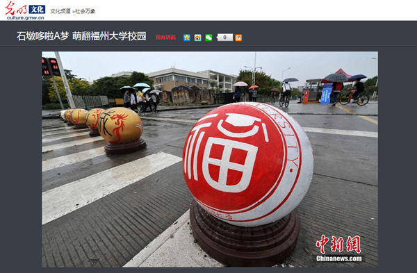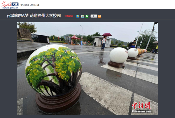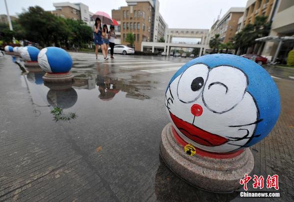 5月4日,在福州大学校园内,一排单调的石墩变成了“萌萌哒”的哆啦A梦,吸引了许多过往学子们的眼球。据了解,石墩哆啦A梦由该校几名学生手绘而成,一个个可爱的哆啦A梦悄然成为校园里一道风景线。中新社发 张斌 摄