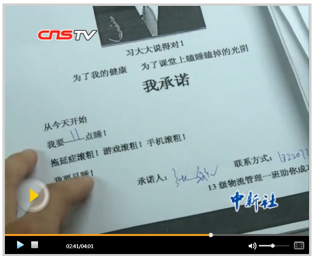 2015年4月15日开始,福州大学经济与管理学院2013级物流管理1班发起“习大大喊你早睡”活动。他们在线上发布微博宣言,让“熬夜党”转发并附言“我要早睡”,此外,他们还进行现场宣传,让同学们签署“早睡协议书”。此后,这个班级安排专人在承诺早睡者选择的睡觉时间前20分钟进行短信提醒。5月4日,记者也来到了福州大学实地采访。