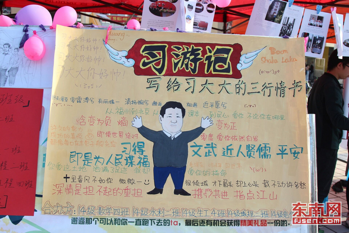 东南网4月13日讯(大学生通讯员 张惠敏)“习以为常,近民亲民,平心向民”、“从福州到北京,从课本到民心,依旧敬爱你”、“深情是担不起的重担,携手共进,指点江山”……4月12日,福州大学青春广场出现了一张题为“习游记”的大海报,上面写满了福大学子给“习大大”的三行情书。