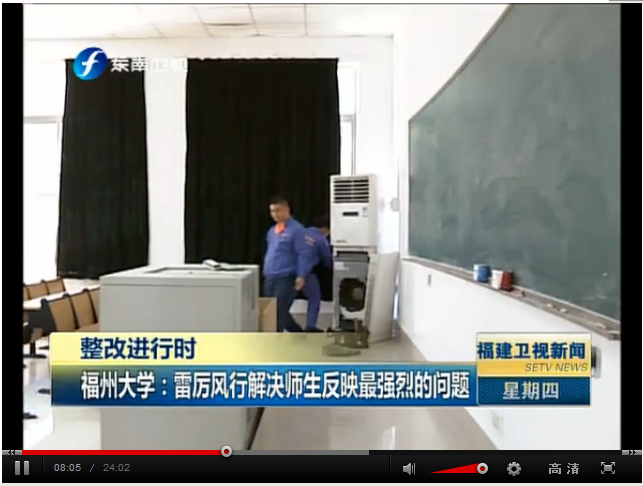 夏季的福州,湿热天气令人难受。(福州大学学生:非常难受就算吹着风扇 还是非常热) (福州大学学生:大家都说没有空调 都没办法上课了)教室里安装空调以改善学习条件,成了福大师生提得最多的要求,在党的群众路线教育实践活动中,校方有了行动。(刘松青 福州大学后勤基建资产管理处 处长:教学楼安装空调 原先设计的时候 没有考虑 空调的电容量和机位 有很大的困难 问题需要解决 而且我们暑假才能安装 9月1号学生就要来上课 所以 时间非常紧 任务非常重) 福州大学精心安排,利用暑假两个月时间,进行电路扩容改造、政府采购和安装调试,赶在开学前,给所有教室都装上了空调。(陈永正 福州大学 党委书记:学校需要改进的工作很多 我们根据整改的项目内容 轻重缓急 也根据学校的条件 包括财力的情况 分门别类来进行整改 ) 对于在群众路线教育活动中发现的问题,福州大学列出整改时间表,立行立改。(林志凯 福州大学宣传部 部长: 根据教代会教师和我们收集到的师生员工的意见 我们想在我们美丽的学校能够更增加一点人文的气息)还是利用这次暑假,福大在校园内打造了翰墨石园、书法园、以及雕塑区。从资金的筹措到项目的完成,从学习条件的改善到校园综合素质的提升,福州大学用一项项整改行动 取信于师生。(陈永正 福州大学 党委书记: 要把活动的成果固化下来 用制度的形式 体制机制的建立 来保证我们密切联系群众 保证我们真心实意的为师生服务)