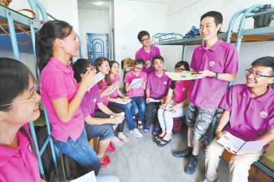 10日,在漳浦县少年军校,福州大学经济与管理学院带队老师叶阁泽(右二)与福州大学志愿者一起讨论如何辅导孩子们适应军校生活。福州大学2014年大学生暑期科技文化卫生“三下乡”社会实践活动于本月全面展开,全校187支实践队奔赴全国各地开展志愿服务工作。 (林善传 摄)