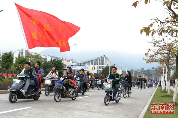 东南网3月10日讯(通讯员福大学生记者团 程瑶 冯柔佳)3月9日下午福州大学校园里出现一批绑着绿丝带的车队,既有自行车,也有电动车,数十人的队伍浩浩荡荡地在福大校园校园骑行,“绿油油”的丝带赚足了回头率。
