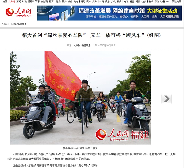 人民网福州310日电(通讯员 程瑶冯柔佳)39日下午,福大校园里出现一批车头绑着绿丝带的车队,既有自行车,也有电动车,数十人的队伍浩浩荡荡地在福大校园校园骑行,“绿油油”的丝带赚足了回头率。