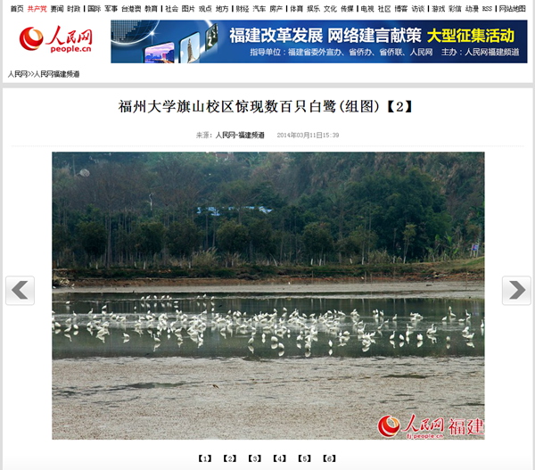 人民网福州3月11日电(通讯员 李连富)近几日,只要从福州大学旗山校区行政南楼附近经过,就可看见旁边的水池中集聚了一大群白鹭,数量达数百只。只见它们时而飞起,时而觅食,景象极为壮观。吸引了不少学子的驻足观看和摄影爱好者的拍摄。