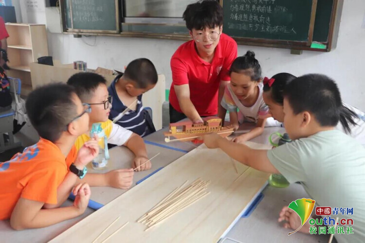 图为“百年红船精神进课堂,闽中革命事迹驻我心”实践队成员指导孩子们搭建红船模型。中国青年网通讯员 吴涵瑞 摄
