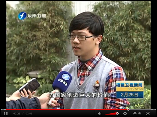 2014年2月25日,我省党的群众路线教育实践活动先进典型事迹报告会在福州举行。我校师生于当天上下午分别在福建会堂和师大旗山校区大会堂听取了两场报告。报告会后,我校学生接受了东南卫视《福建卫视新闻》的采访。