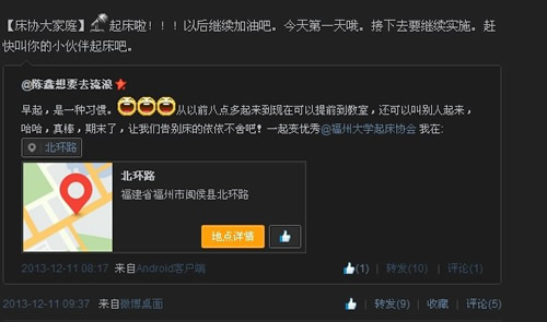 据陈静介绍,不仅陌生的学生之间互相打电话喊对方起床,起床协会开展活动时,还会根据一个原则,那就是异性原则,“男生叫女生起床,或者女生叫男生起床”。从实际情况来看,活动取得了不错的效果,被叫起床的同学会立即发微博,感谢起床协会的帮忙。