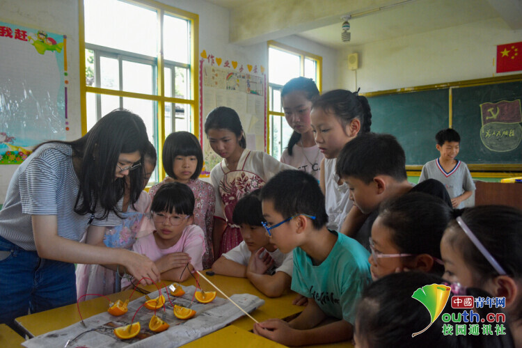 图为实践队队员与当地小朋友做水果发电小实验。中国青年网通讯员 蔡曾 摄