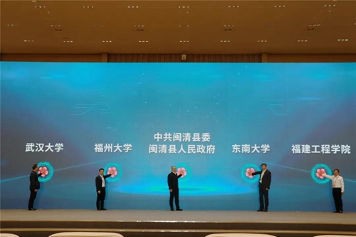 林志斌与东南大学副校长、发展委员会主任黄大卫、福建工程学院副校长何仕、福州大学土木工程学院副院长赖志超、武汉大学土木建筑工程学院副书记谢献谋完成共建仪式,标志着“东南超低能耗建筑技术工程研究中心”筹建正式启动。