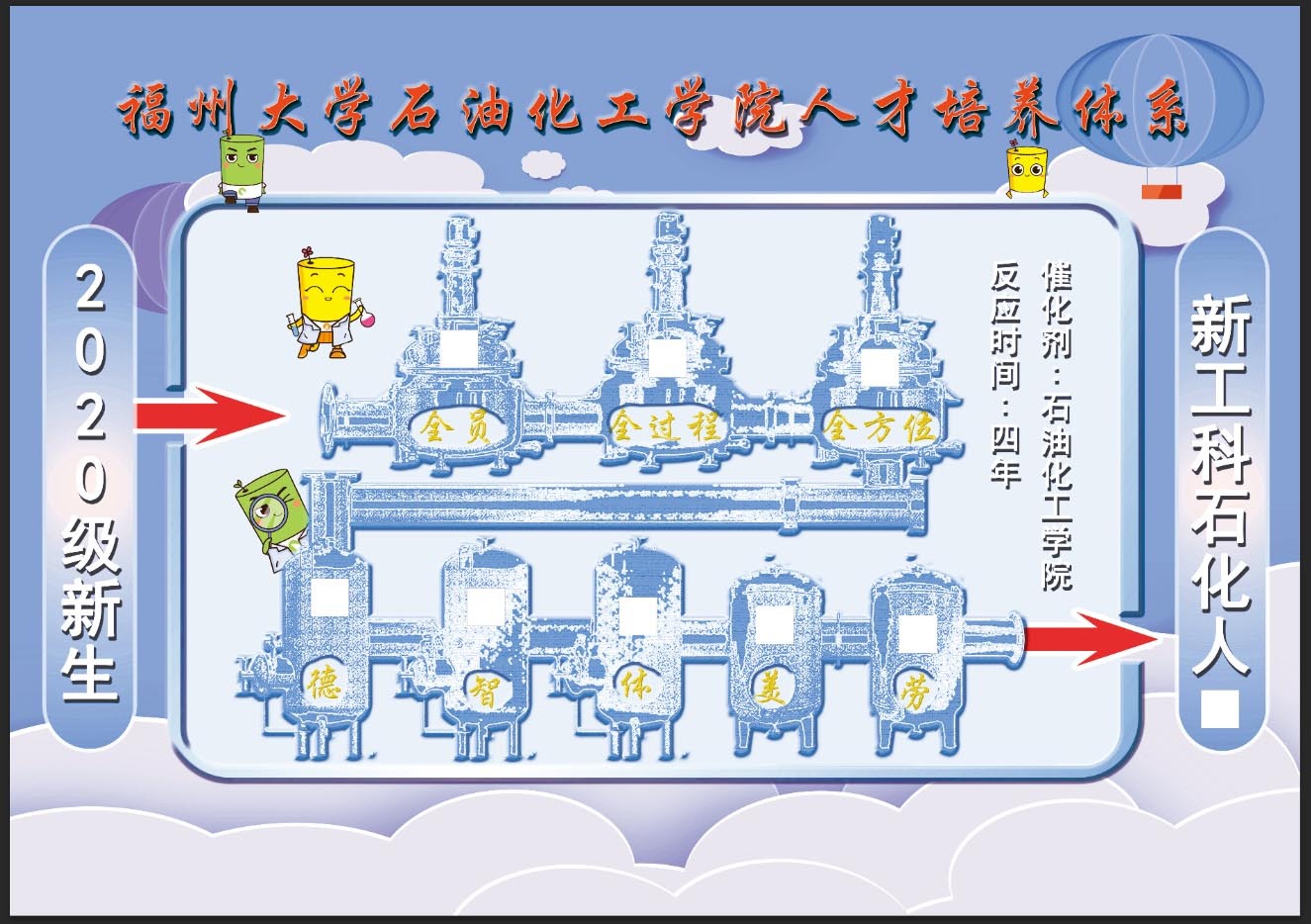 一直以来,福州大学石化学院从催化角度精细把握人才培养目标:基于“催化剂”的特性,结合学科特点,加强校企融合,从催化的角度定义人才培养目标,以“入学启航—学海凌云—毕业扬帆”的思政三部曲为基础,落实化工人才培养目标,打造招生-培养-就业一体化体系,实现了企业与高校人才培养的目标一致性。