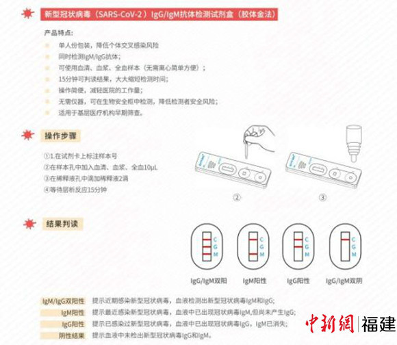 图为新型冠状病毒(SARS-CoV-2)IgGIgM抗体检测试剂盒(胶体金法)说明。资料图