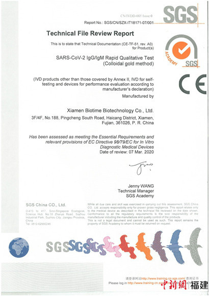 中新网福建新闻3月12日电(苏新宏 蓝苗)11日,记者从福州大学获悉,由福州大学食品安全与生物分析教育部重点实验室、福建省健康智能诊断技术工程研究中心、北京中卫生物科研转化研究中心首席科学家林振宇教授课题组与厦门宝太生物科技有限公司研制出的冠状病毒(SARS-CoV-2)IgG/IgM抗体检测试剂盒(胶体金法),于10日正式通过欧盟授权的权威认证机构SGS的第三方认证,获欧盟CE准入。目前试剂盒已正式投产,月产能可达300万人份以上。