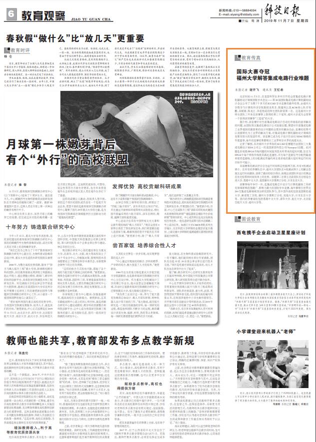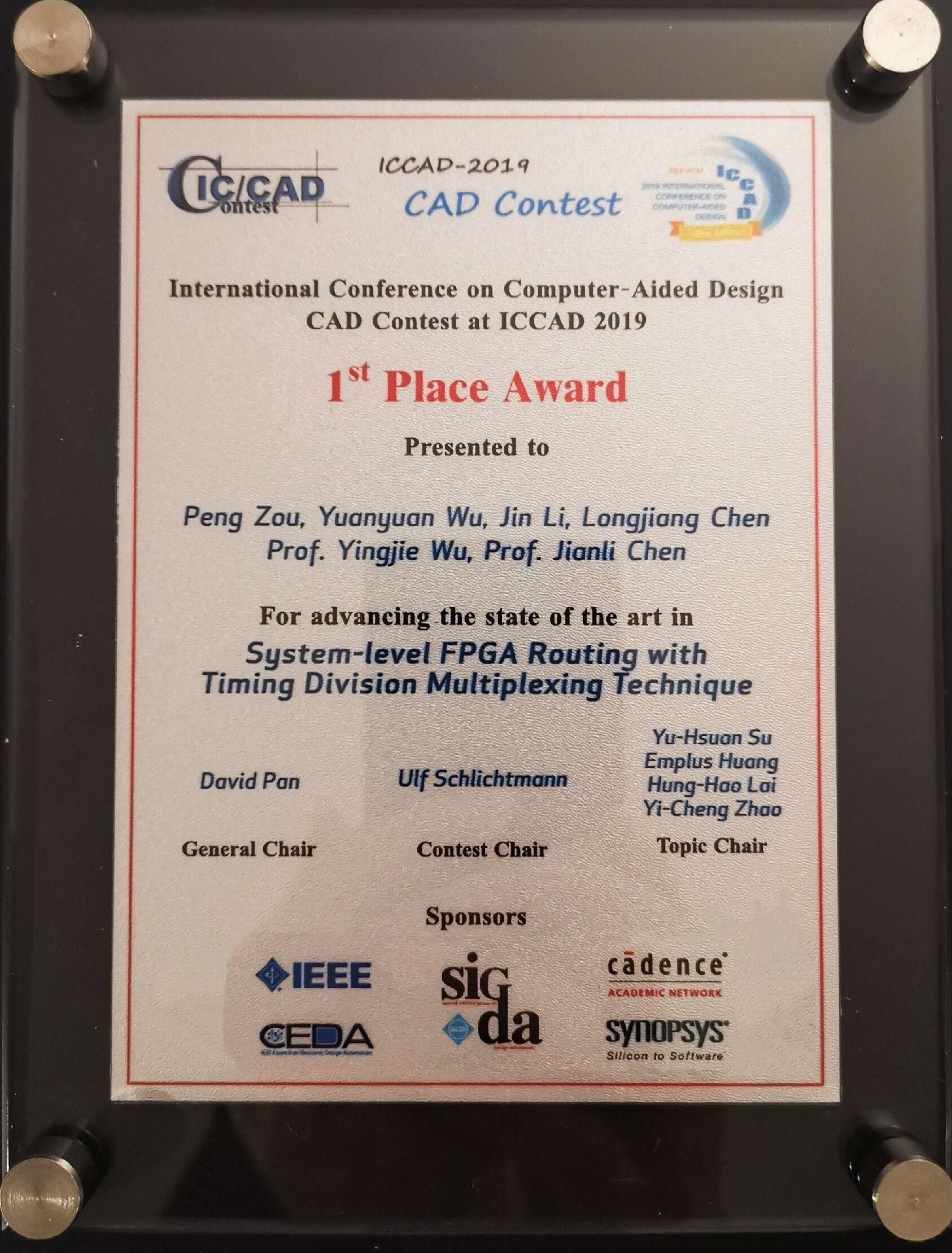 北京时间2019年11月5日,在美国科罗拉多州召开的全球集成电路计算机辅助设计领域顶级学术会议——第38届国际集成电路计算机辅助设计会议公布了为期7个多月的ICCAD学术竞赛的最终结果,由福州大学数学与计算机科学学院吴英杰教授、陈建利教授以及ACM核心队员邹鹏、吴媛媛、陈龙江、李进组成的师生团队斩获第一名。这是福州大学师生团队三年来在该赛事上取得的第三个冠军,也是中国大陆在该项赛事中第三次获得冠军,福州大学成为全球第一个获得该项赛事“三连冠”的大学。