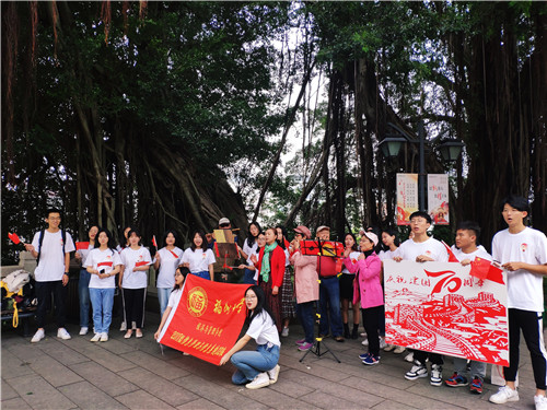 于三坊七巷,尽管有丝丝雨点,但在场群众依旧热情的参与进了信管02班团支部的活动中,乌山口琴队与福大学子的热情碰撞,一首我和我的祖国洋溢在整个乌山,口琴队崔敏老先生热情表示:“你们年轻人怀揣着爱国的初心,将来一定能够成为栋梁!”