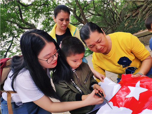 图为福大学子与小朋友共同剪纸。黄睿摄