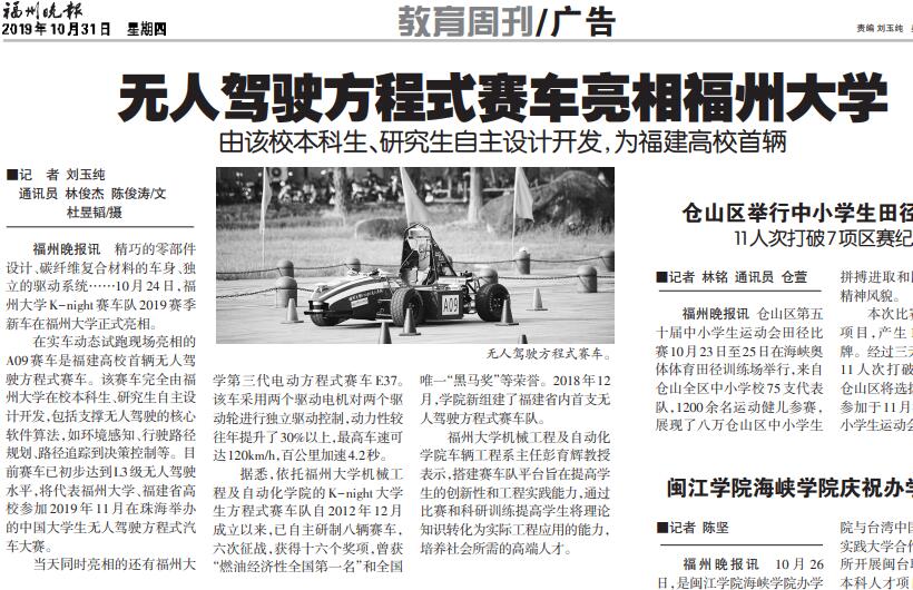 据悉,依托福州大学机械工程及自动化学院的K-night大学生方程式赛车队自2012年12月成立以来,已自主研制八辆赛车,六次征战,获得十六个奖项,曾获“燃油经济性全国第一名”和全国唯一“黑马奖”等荣誉。2018年12月,学院新组建了福建省内首支无人驾驶方程式赛车队。