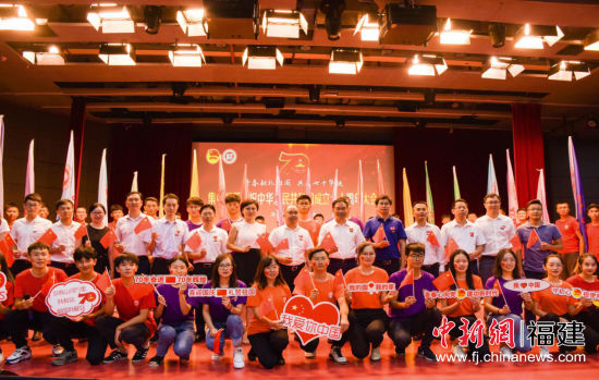 图为福州大学师生代表手持国旗、祝福KT板合影。 郜泽宇 摄