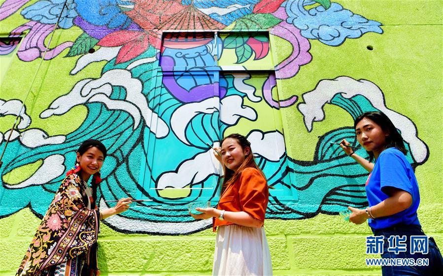 6月15日,2019海峡论坛第二届创意涂鸦巡回赛在厦门市集美区大社文创旅游街区举办启动仪式。本届巡回赛以“共绘家园”为主题,5支队伍20名两岸选手用手中的笔画,勾勒出对共同家园的美好愿景。图为福州大学厦门工艺美术学院的郑曼璐(中)和刘淼(右)与台湾清华大学美术学院研究生张雅岚共同创作涂鸦作品《源园》。