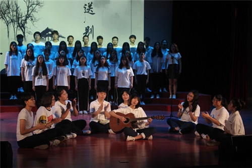 “我们都是追梦人,在今天,勇敢向未来报道”,18级中文班悦耳悠扬的歌声回响大厅,朗诵与歌唱的完美结合引得现场观众阵阵掌声。17级中文班将《送别》与毕业场景的演绎相结合,吉他的弹唱与大合唱相互呼应,将离别的依依不舍表现的淋漓尽致。尽管各个班级带来的歌曲、表演不同,但同学们都用自己的倾情表演展现出了蓬勃的青春风采和良好的班级风貌。