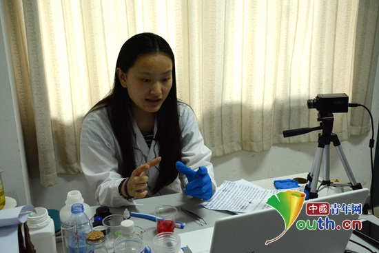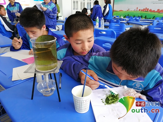 福州大学石油化工学院绿色化工创想协会的甄锦玉向三营中学学生讲解化学化工知识。福州大学研支团 供图