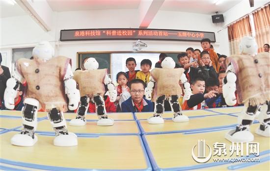 近日,泉港区科协、科技馆联合福州大学石油化工学院组织科技志愿者走进界山镇玉湖中心小学,开展以“创新放飞梦想 科技引领未来”为主题的“石化科普进校园”活动,通过电子百拼体验、机器人展示、石化设备科技创新成果展示等丰富有趣的活动,让前来参加活动的青少年“零距离”感受科技的魅力。图为机器人展示。 (王伟鹏 林明珠 摄)