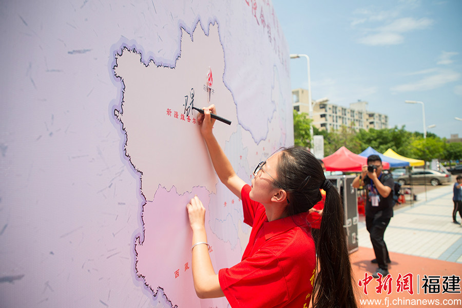 来自全国各地的学子在印有中国地图的太空架上进行火炬传递、签名 李南轩 摄