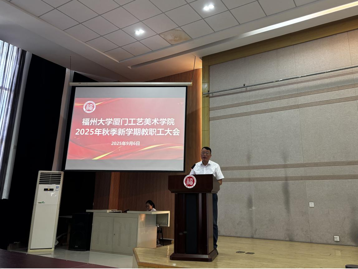 融媒中心讯/9月6日上午,厦门工艺美术学院在2号教学楼311学术报告厅举行2025年秋季新学期教职工大会,组织全体教职工进行理论学习,重点学习习近平总书记在纪念中国人民抗日战争暨世界反法西斯战争胜利80周年大会上的重要讲话精神。