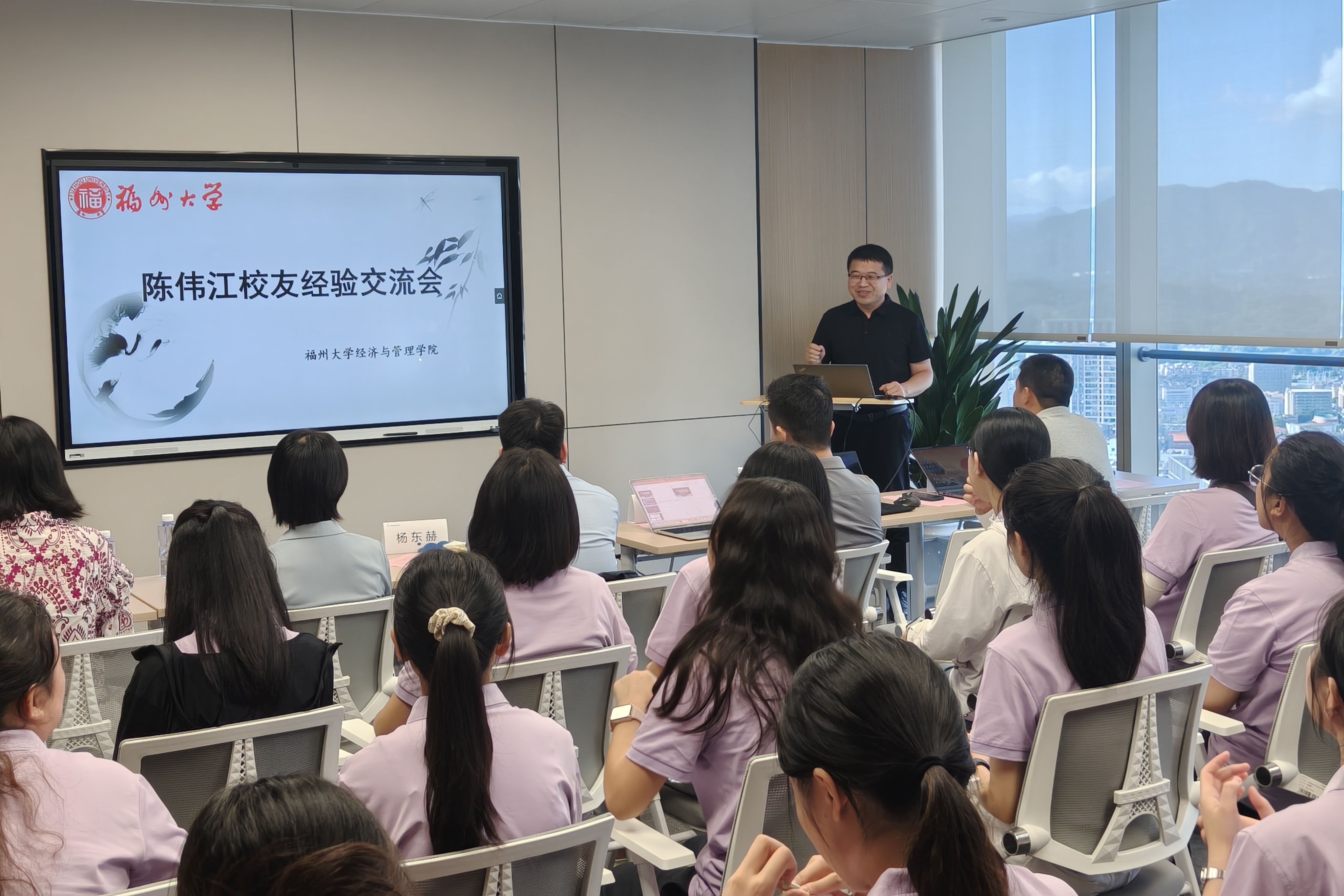 在互动提问环节,同学们踊跃发言,围绕“专业知识如何应用于市场实践”“企业对复合型人才的能力要求”等核心问题,与企业人员展开热烈讨论。为帮助同学们更直观地理解职业成长路径,多位企业专家也分享了自己的亲身经历与心得体会。例如,容诚会计师事务所的项目经理曾清以自身四年来的职业成长轨迹为例,分享了她从审计新人到项目经理的心得体会,为同学们的职业发展提供了具象参考。福州大学校友、金蝶软件福州分公司大客户销售部总监陈伟江结合自身经历,勉励同学们要积极顺应环境变化,在专注耕耘与终身学习中实现自我成长。这种问答与分享相结合的深度交流,真正实现了课堂理论与行业实践的有效对接。